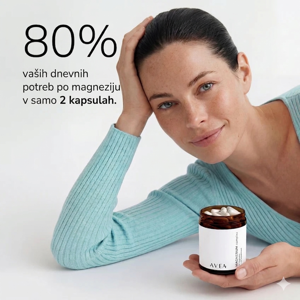 AVEA Magnesium Complex, razvit v sodelovanju z raziskovalci dolgoživosti v Švici, zagotavlja 300 mg elementarnega magnezija iz treh visoko biorazpoložljivih oblik, zasnovanih za podporo živčnemu sistemu, delovanju mišic in presnovi celične energije