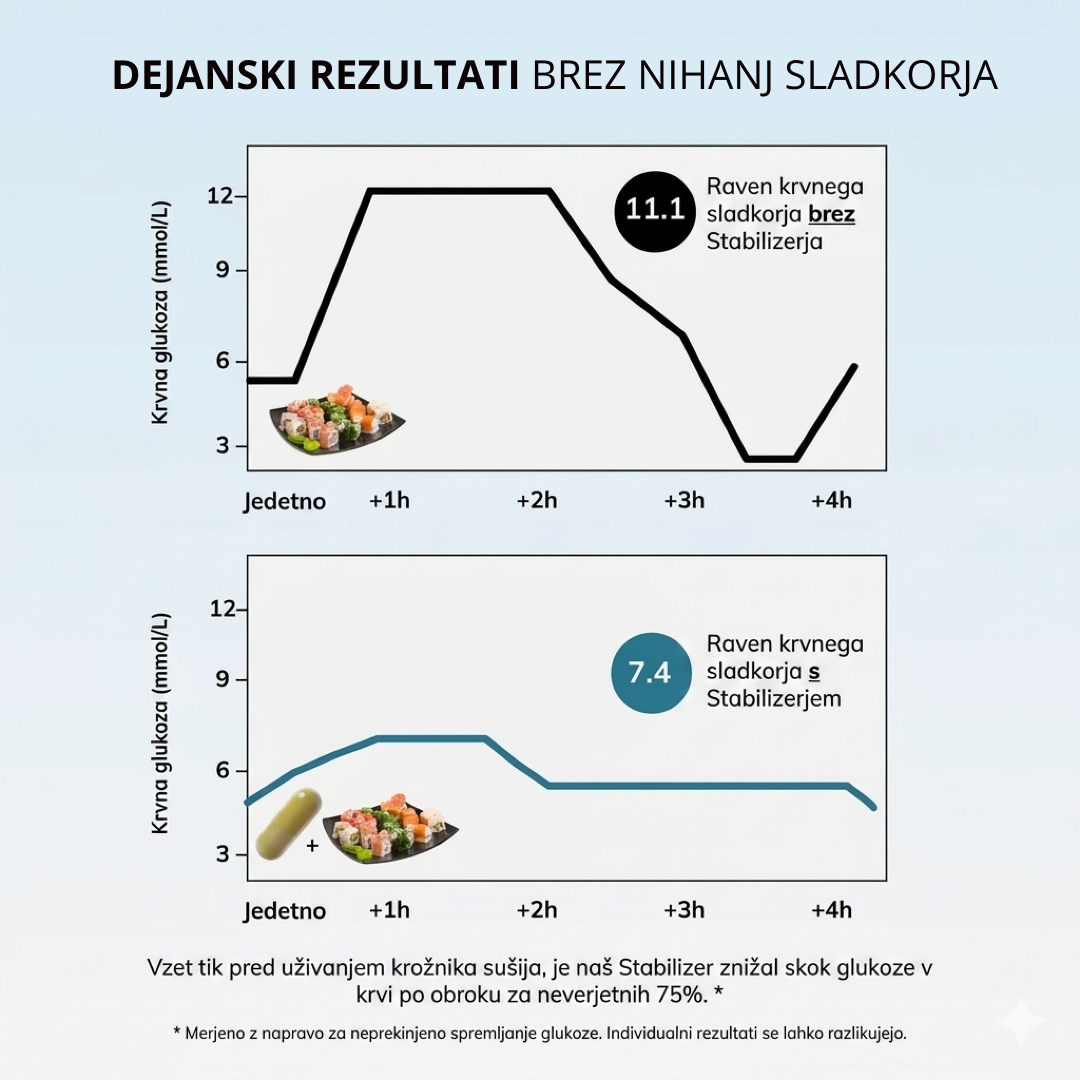 Stabiliser pomaga vašemu telesu, da se bolj inteligentno odzove na sladkor in ogljikove hidrate – z uporabo naravne formule, ki temelji na znanosti in je zasnovana za podporo zdravi presnovi, zmanjšanje želje po hrani ter podporo zdravemu ravnovesju telesne teže.